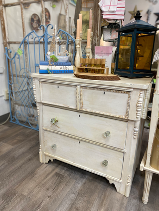 Annie Sloan Old Ochre with dark wax and white wax. Drawers are lined. Scalloped glass top